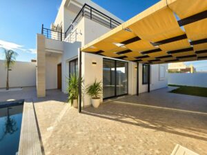 Extérieur & Prestations : • Piscine 7.5 × 3.5 m • Jardin paysagé (palmiers, gazon) • Climatisation chaud/froid • Stores électriques étanches • Panneaux solaires • Système de sécurité avec caméras • Garage + accès pour une deuxième voiture