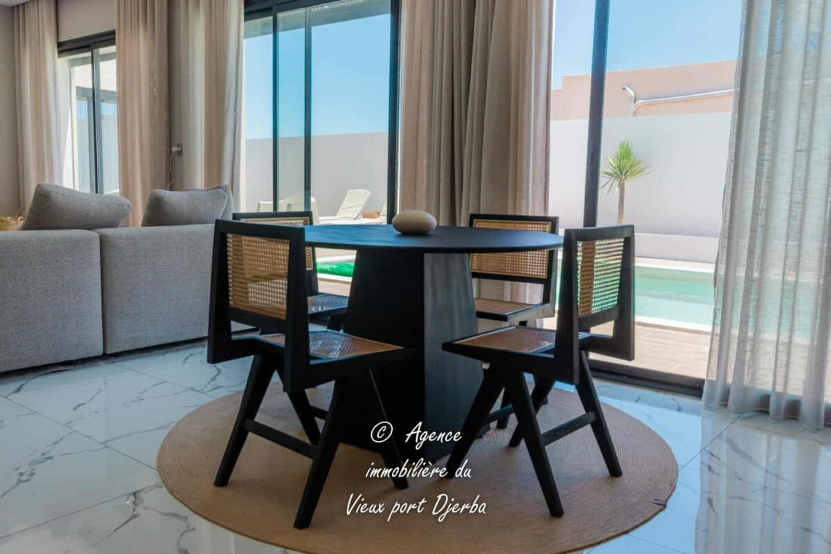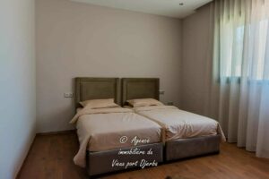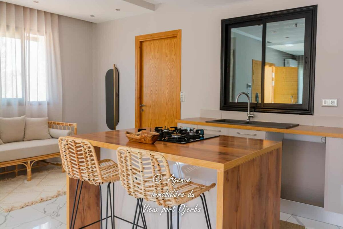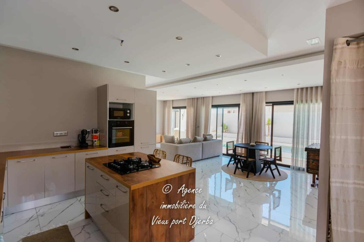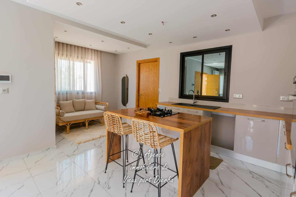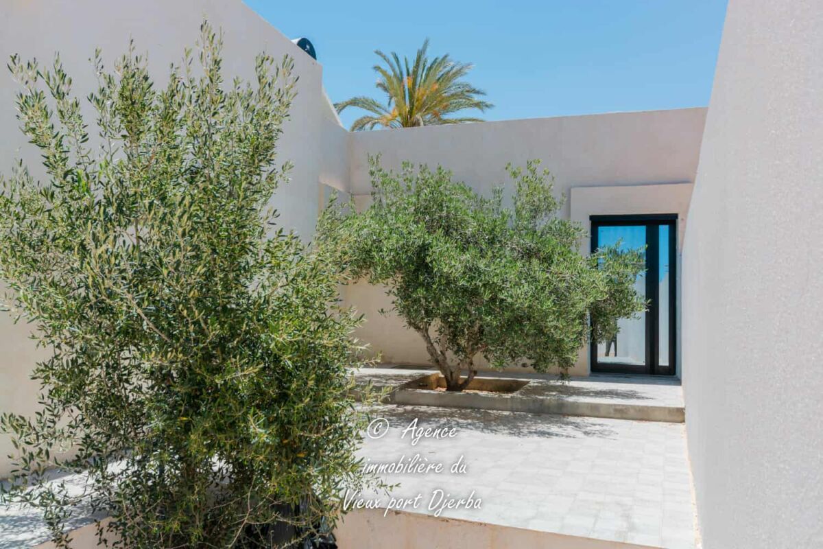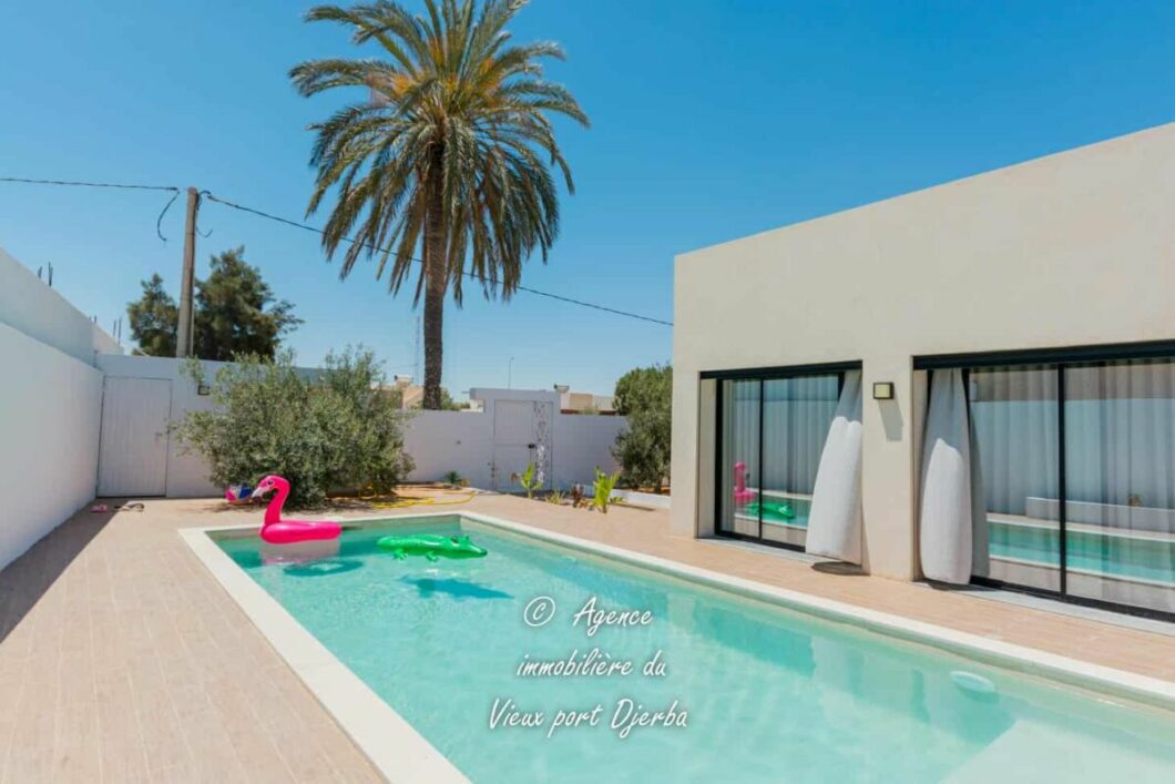 L’agence du Vieux Port Djerba met à la vente une belle villa plain pied avec piscine et un studio indépendant , situés dans le quartier calme et agréable de Houmt Souk et très proche de la route goudronnée reliant le quartier de Fatou et Ghizen.