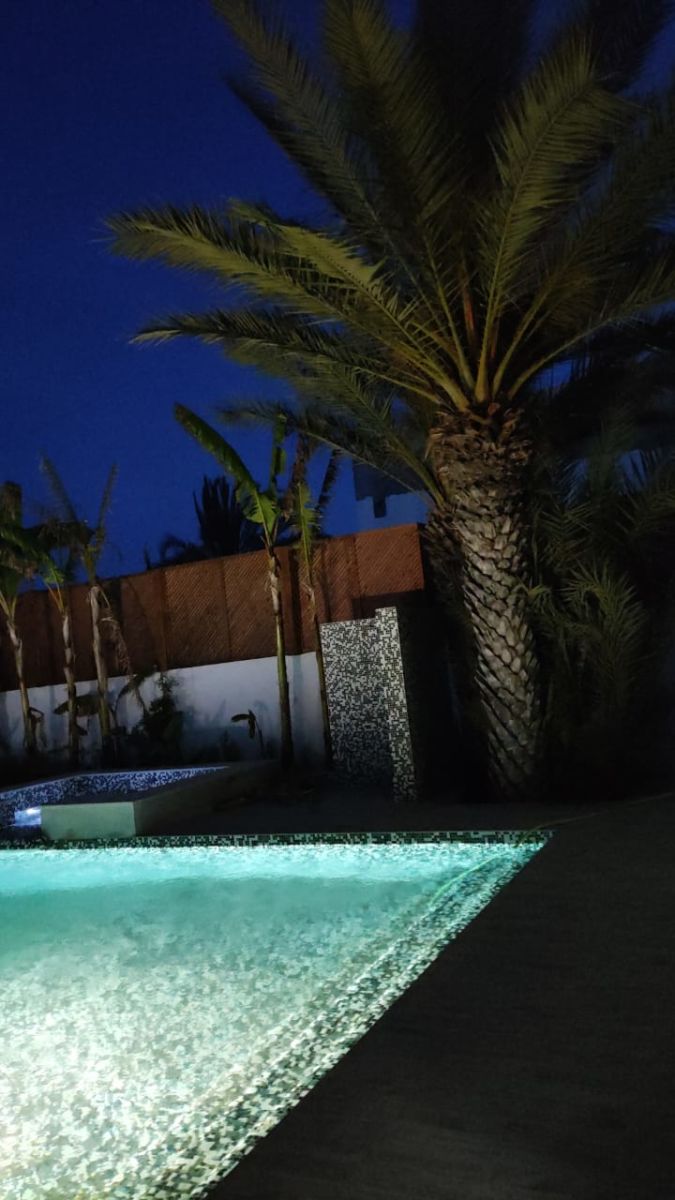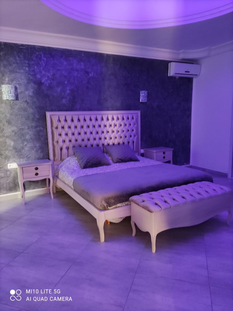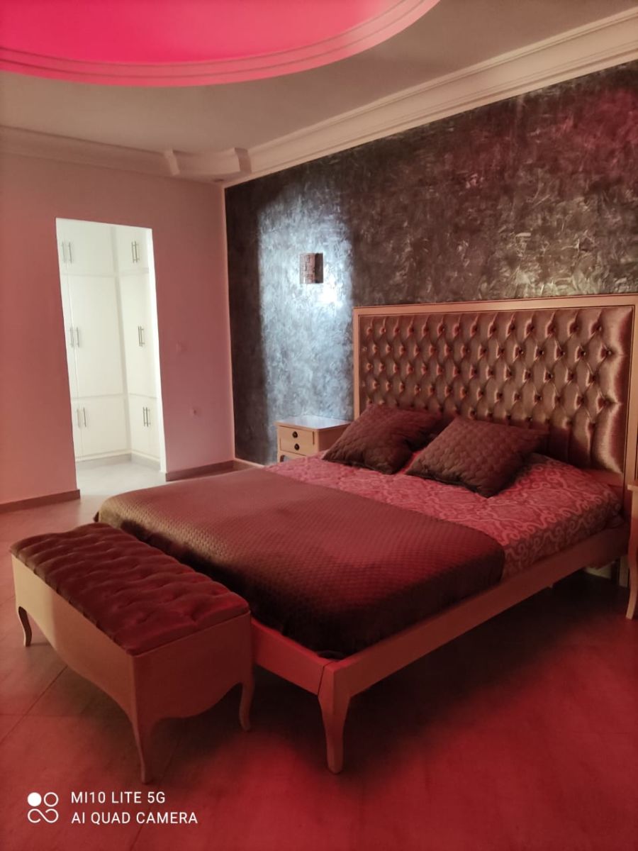 Au rez-de-chaussée: cuisine bien équipée ouverte sur le salon, une salle d’eau , laves main, deux chambres avec balcon et arrangements et une terrasse spacieuse donnant sur un jardin bien arboré et une piscine skimmer 10/5m avec pataugeoire.